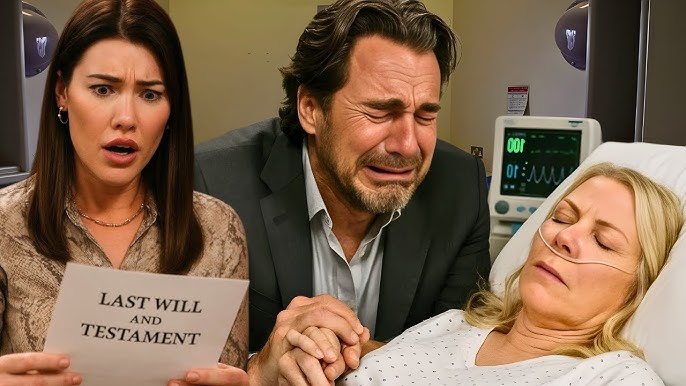 When the letter falls into Ridge’s hands at the hospital—where the family has rushed following a medical emergency involving Hope—the emotional foundation of the entire clan shatters. Ridge tries to read it aloud, but the words choke him into silence. Hope, already fragile as she lies trembling on a hospital gurney, breaks down completely when she hears her mother’s deepest, final thoughts. The scenes are filmed with an aching stillness: monitors beeping softly in the background as the truth crumbles everyone in the room.